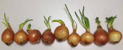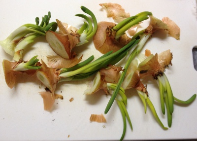 昨日買っておいた玉葱のネットをみたら形状がなにかおかしい。「ん?」と思いながらよく見ると玉葱の先から緑色の物が出ている。ネットから取り出してみたらこんなにあった。