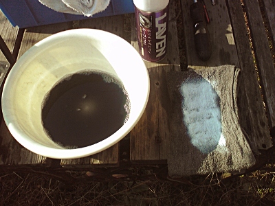 こうすると直接スプレーするより薄く均一にチェーンに塗布できるんだよね。チェーンオイルは灯油でよくのびるようになるし、灯油はそのうち乾いてしまうのでチェーンオイルだけが薄く残るって寸法。ちなみに左の洗面器の中のキタネー液体がチェーンの汚れを取った灯油ね。