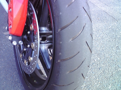 途中でタイヤを確かめてみると、相変わらず前輪はこんな感じで端までは使えていない。つか、こんなにラウンドしているタイヤの端まで使うのってどうすればいいの?って気分。
