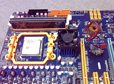 そこで強制的に冷やせるよう、FANつきのクーラーを購入。ピンの位置が分からなかったのだが、汎用性があるようなのでコレに決定した。980円ナリ。大きいかなと思ったが、意外や意外、元のヒートシンクよりも小さいことが判明。こりゃラッキー。