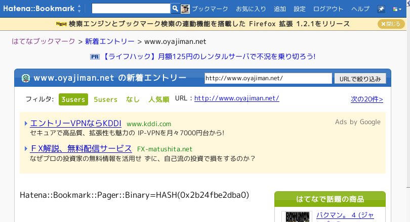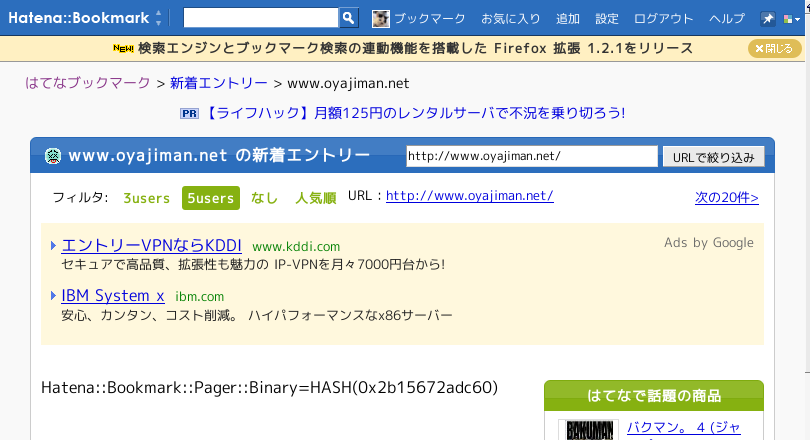 ただいま2009年8月10日17:00のちょっと前、ハテブの新着エントリで自分のサイトを検索すると面白い結果が出た。ちょっと面白かったのでスクリーンショットを取っておいた。