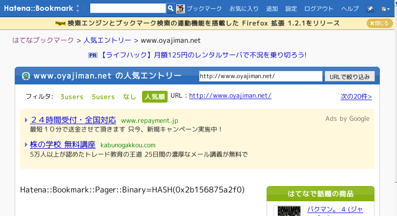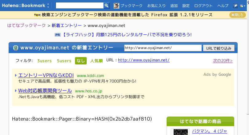 この不具合、あっという間に直ってしまっているので、今はもう見る事ができない。HASH値も当然ながら検索の度に変化するが、ブックマークユーザー数での絞り込みやブックマーク数による並べ替えもHASH値に変換してDBに渡しているようだ。まぁ当たり前なんだけど・・・