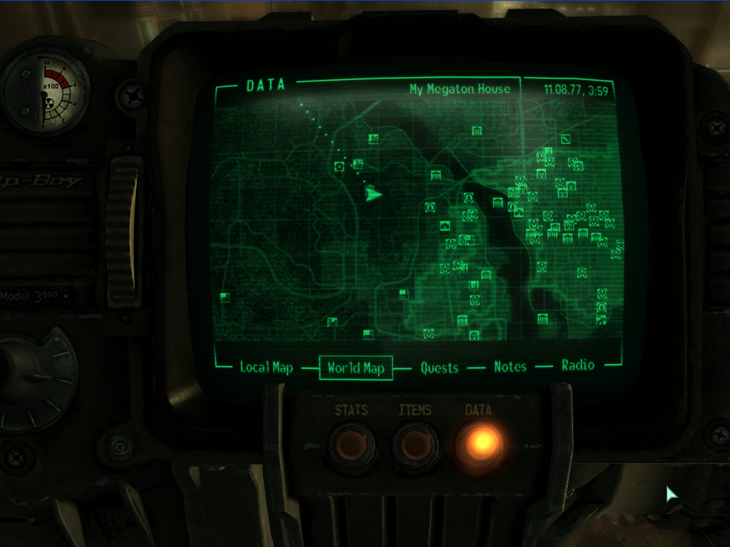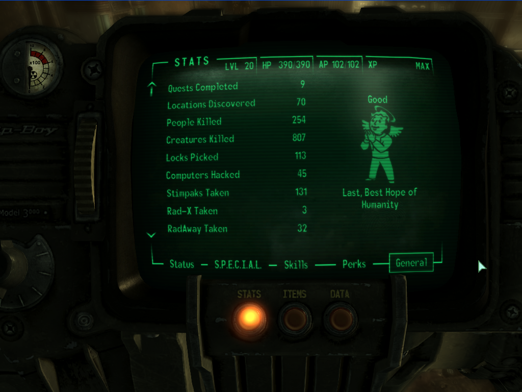Pip-Boyの右上に注目。なんとXPがMAXになっている。なんということだ。Fallout 3ではレベル20で打ち止めなようだ。