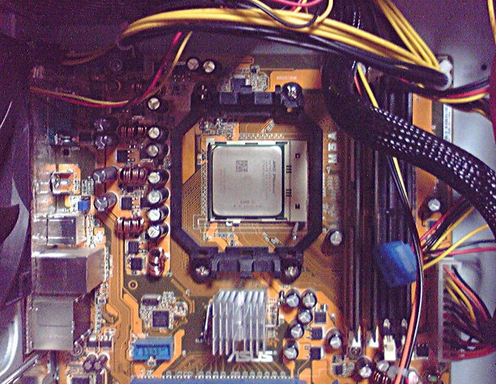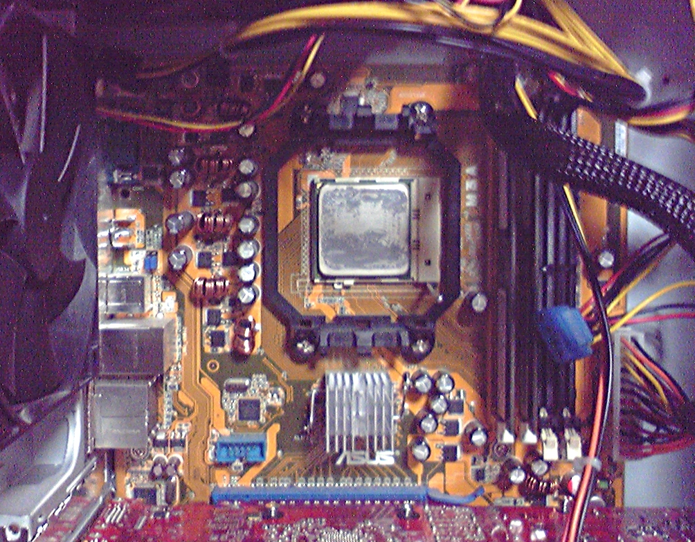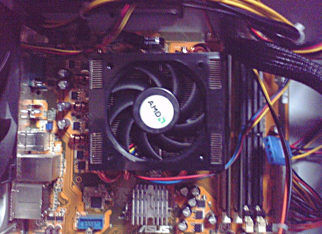 早速マシンにインストール。以前のAthlon64X2 5600+のCPUクーラーを外すの図。もともとCPUクーラーに塗布してある熱伝導用のグリスが融け出してCPUの表面がキタネー。