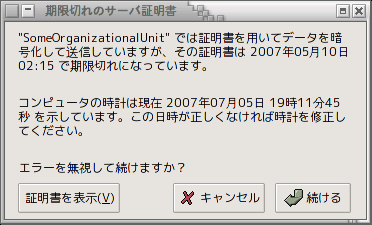 友人宅サーバではSSLでアクセス出来るようにもしているんだけど、最近になって期限切れのダイアログが出るようになっていた。この証明書、VineLinuxをインストールしたとき勝手に出来ている奴で、証明書のサンプルみたいなもんだ。こんなの別にどうでもいいやと思っていたのだが、この表示を毎回見るのも気分が悪いのも確か。