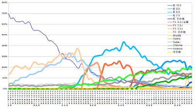 ブラウザヴァージョン別では、IE10、Android、Safariがシェアを伸ばしている。逆に落ちが著しいのはIE9で、着実にIE9から10への移行が進んでいる模様。それもシェアを落としながら。前月比較だけで見ると、Chromeも比較的シェアを落としている。