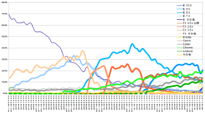 ブラウザヴァージョン別ではIE10が確実にシェアを伸ばしてきている。と言ってもIE9からのリプレイスという状況の模様。全体のアクセス数が減るとFX系はシェアが上がるのだが、今回もFX4以降が着実にシェアを回復させた。意外にもAndroid、Chromeは特段の伸びはないが、Safariも前月が異常値だったことを考慮しても若干の伸びを見せている。今までサイト管理者を泣かせていたIE6は、ここ一年でやっと表舞台から消えつつあるようだ。