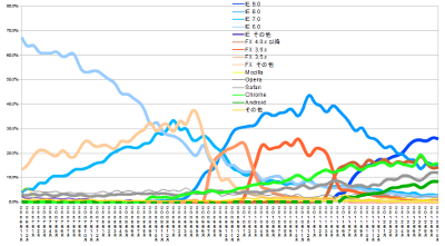 1位 IE9 25.8%(前月▲0.4%)、2位 chrome 15.8%(前月+0.6%)、3位 IE8 15.1%(前月▲0.2%)、4位 FX4以降 14.3%(前月+0.3%)、5位 safari 11.8%(前月▲0.2%)、6位 Android 8.3%(前月±0.0%)