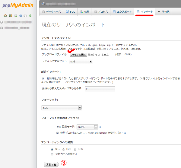 2、 phpMyAdminで新しいデータベースにログインし、先に取ったバックアップデータをインポートする。