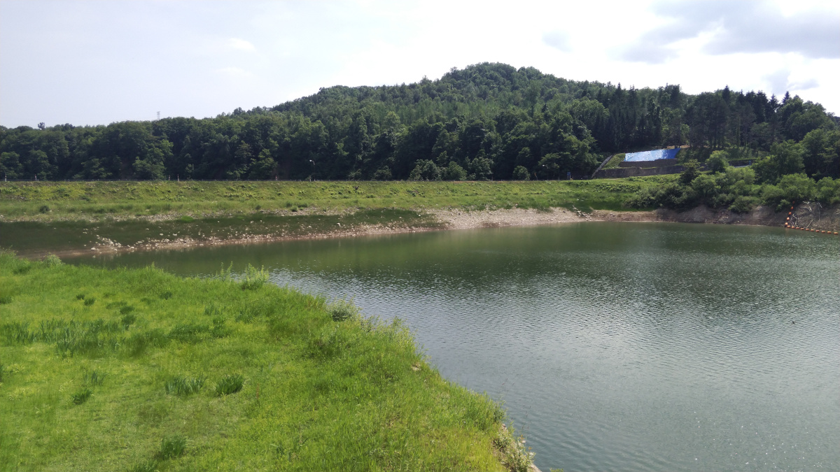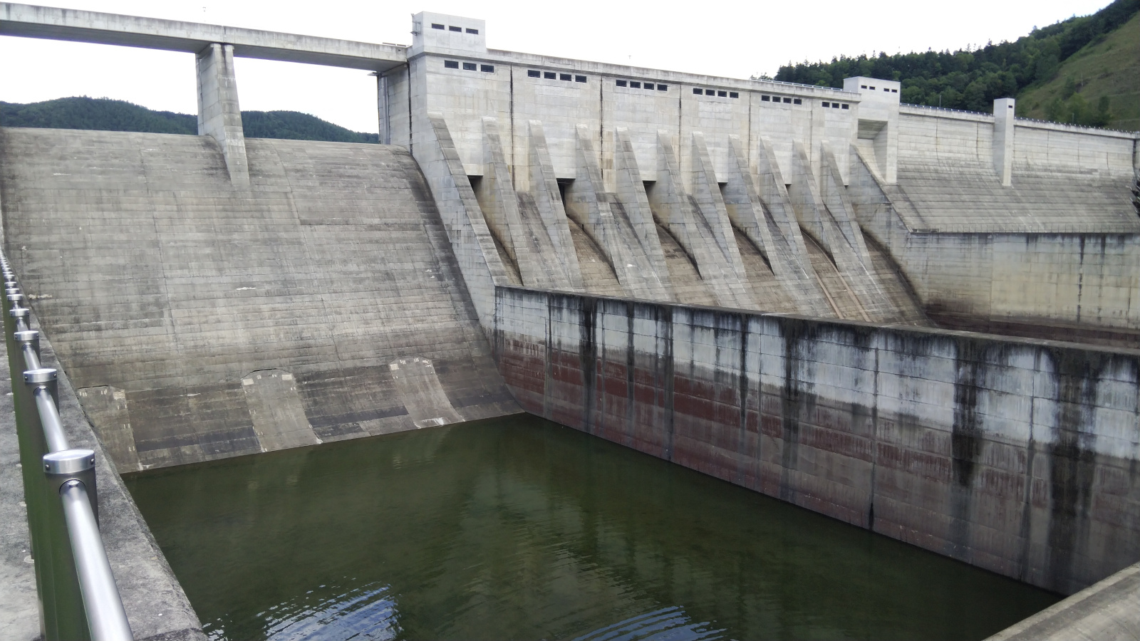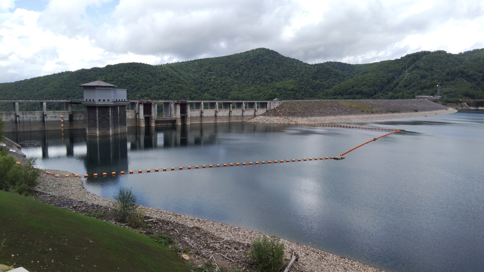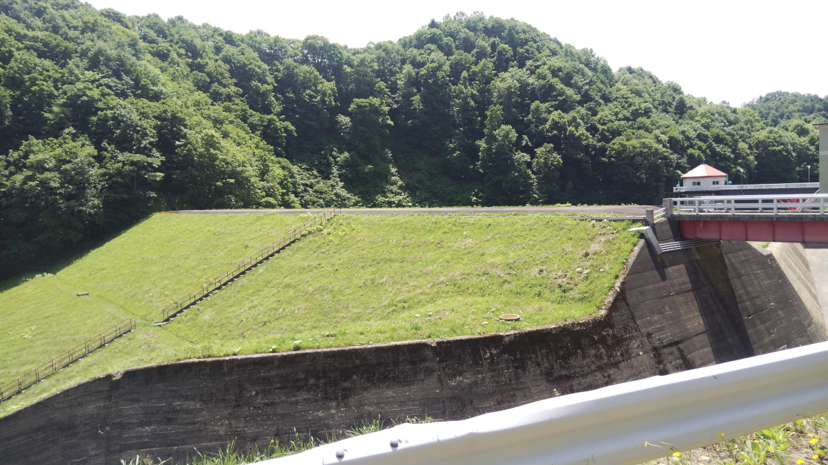 放水用の水路がグルーっと回り込んでいる形のアースダム。全景が分かるような写真を撮れるポジションがない。ここの川は「ルークシュベツ川」というらしい。