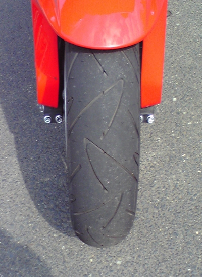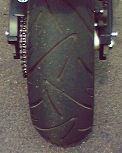 峠に行って走ってみたが、その操縦性のよさに一層感動した。一言で言ってしまえば「リーンウイズが楽しいタイヤ」だ。倒し込みは軽く、倒し込んだ状態での安定性も抜群である。乗っていてムチャクチャ楽しい感じ。それなりのペースで走るにはうってつけのタイヤかもしれん。CBR600Fみたいなバイクにつけたら最高だと思う。というか、CBR600RRもOEMがこのタイヤでいいんじゃないか?で、峠に行った後のタイヤがこれ。リアの写真はWillcom03のカメラ性能がクソでとんでもない色になったので、GIMPで補正してある。
