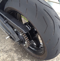 まずは早速一番楽しみの峠にいく。土曜日だがほとんど誰もいなかった。前回もいつもよりマシンを寝かせてみたが、今回はそれよりもうちょっとだけ寝かせてみた。いつもよりコーナリング中の路面はとても近く、もう一段寝かせたらこの高い位置にあるステップも路面につくかもなーと思いながら走る。タイヤのグリップは素晴らしく、滑る気配もなくて全く怖さを感じない。この峠は4往復した。その後タイヤを見てみると、後輪はほぼ全面、前輪も残り1cmもない程使っていた。やっぱり結構寝かせていたようだ。