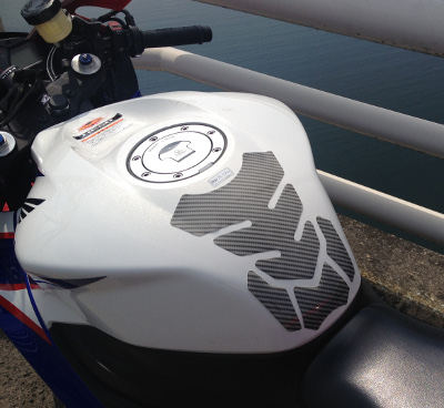 このタンクパッド、送られてきたときにはプラスチックの透明なケースに入っていたのだけれど、そのケースにこのタンクパッドの表面が結構強くくっついていて参った。だけどそれを利用して、先に裏のシールを剥がしてタンクにそのまま貼ったら、位置決めがしやすくて良かった。そのあと結局ケースからタンクパッドが剥がれにくくて難儀したけどね。安いからしょうがないよな。