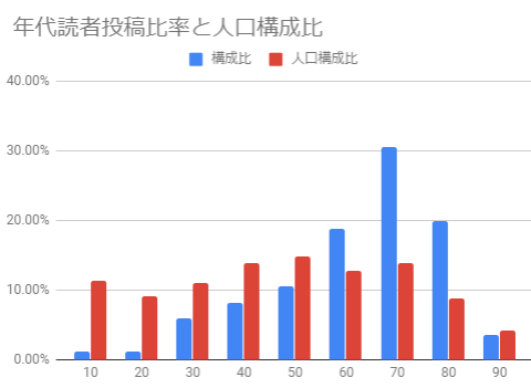 予想はしていたものの、改めて実数を見るとあまりの偏り具合にめまいを覚える。60~80代の合計で人口構成比のほぼ倍の70%近くにもなるのである。これからみんなを支えていくであろう10~50代はたったの27%だ。人生残り10~20年の人の意見で北海道新聞の読者欄は構成されていると言えよう。